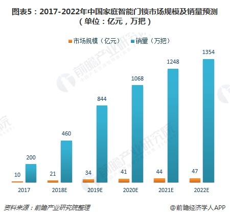 假设我国经过未来5年的发展,2022年智能门锁的家庭渗透率将达到35%,达到欧美的渗透率,逼近日韩;同时到2022年,房屋交易的50%伴随着智能锁的销售。那么,到2022年,中国家庭智能门锁总销量将达3250万把,市场规模为390亿元。
